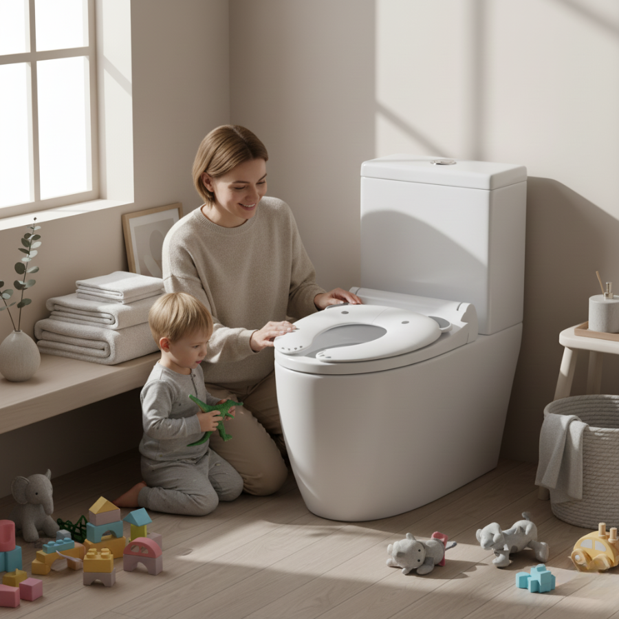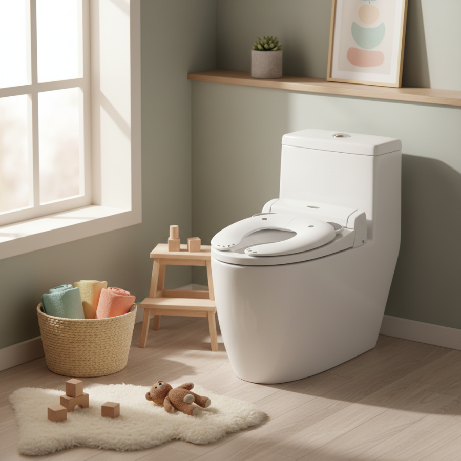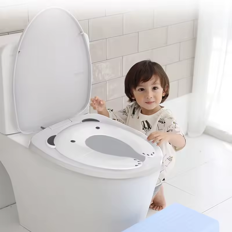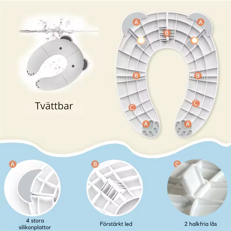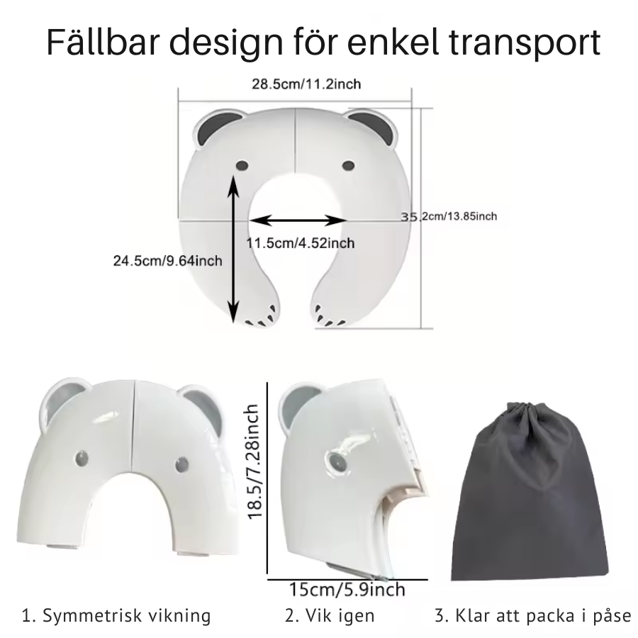 Sitsen fälls enkelt ut och placeras ovanpå en vanlig toalett. De halkfria kanterna och den stabila designen gör att den ligger säkert på plats, så att barnet kan känna sig tryggt och bekvämt under toalettbesöket. Passar de flesta standardtoaletter både hemma och på resan.